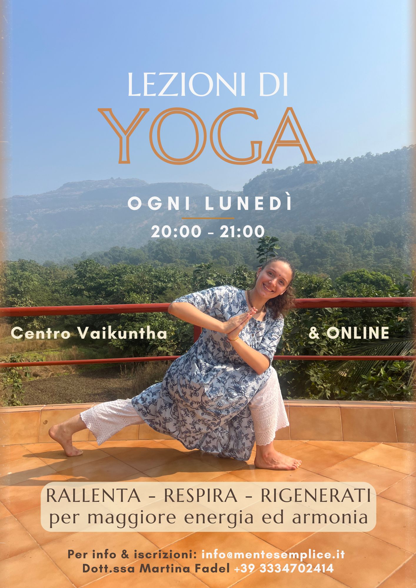 Il corso di yoga si tiene ogni lunedì alle ore 20:00 presso il centro Vaikuntha in via G. Nadi 6 (dietro il bar Lunette).Portare un tappetino e una copertina per coprirsi per il rilassamento finale.
