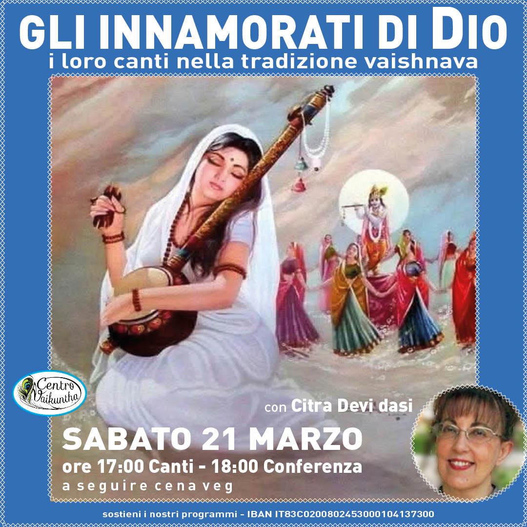 Sabato 21 Febbraio 2026 presso il Centro Culturale Vaikuntha si terrà la conferenza dal titolo: “Gli Innamorati di Dio – I loro canti nella tradizione vaishnava” con Citra Devi dasi.Note sulla relatrice: Citra Devi dasi (Cinzia Honnorat) Docente al Conservatorio di Musica di Rovigo, da più 30 anni studia le filosofie orientali e pratica il bhakti yoga. Nella vita quotidiana coniuga la sua formazione cristiana con la grande spiritualità dell’India. È vegetariana da oltre tre decenni.