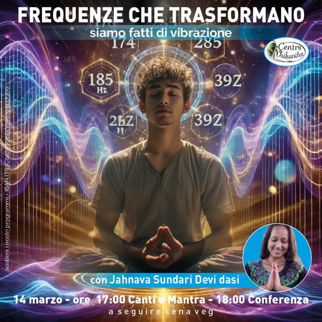 Sabato 14 marzo 2026 presso il Centro Culturale Vaikuntha di Bologna si terrà la conferenza dal titolo “Frequenze Che Trasformano – Siamo fatti di vibrazione”. Ogni parola, ogni pensiero, ogni emozione emette una frequenza che influenza il nostro corpo, il nostro sistema nervoso e il nostro stato interiore. Con questa conferenza esploreremo il potere scientifico, psicologico e spirituale del suono e come le vibrazioni possono regolare, guarire e trasformare. E tu a quale frequenza stai vivendo?Note sulla relatrice: Jahnava Sundari Devi dasi pratica la tradizione del Bhakti yoga da vent’anni, è insegnante di yoga a livello internazionale, formatrice e conduce ritiri intensivi sui chakra in diverse parti del mondo. Nei suoi insegnamenti integra pratica, spiritualità e consapevolezza energetica. È anche naturopata e ha studiato musica tradizionale indiana nel Bengala occidentale e terapia del suono a Rishikesh, in India.