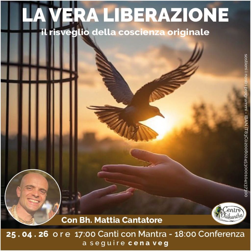 Sabato 25 aprile 2026 presso il Centro Culturale Vaikuntha di Bologna si terrà la conferenza dal titolo “La Vera Liberazione – Il risveglio della coscienza originale” con Bh. Mattia Cantatore.Note sul relatore: Mattia Contatore è laureato in Scienze Internazionali, con un Master in Sociologia e Diritto Internazionale. Si occupa di crescita personale e ricerca spirituale e da tre anni risiede nel tempio di Villa Vrindavana come praticante del Bhakti yoga, seguendo gli insegnamenti di Srila Prabhupada, il Fondatore Acarya della ISKCON.